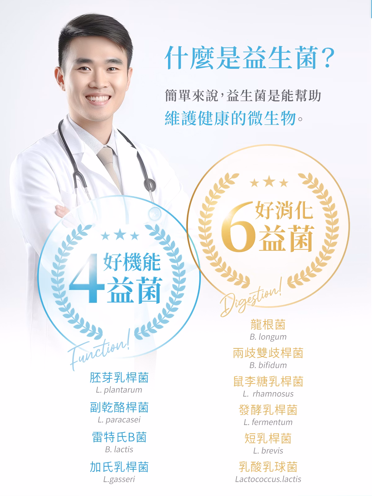 - 成分:赤藻糖醇(甜味劑)、難消化性麥芽糊精、乳酸菌凍乾品(Lactobacillus plantarum、Bifidobacterium lactis、Lactobacillus paracasei、Lactococcus lactis、Lactobacillus rhamnosus、Bifidobacterium bifidum、Lactobacillus brevis、Lactobacillus fermentum、Lactobacillus gasseri、Bifidobacterium longum )、優酪粉(砂糖、脫脂奶粉、麥芽糊精、全脂奶粉、葡萄糖、檸檬酸、酵母精粉、香料、脂肪酸甘油酯)、香料(葡萄糖、香料、微結晶狀α-纖維素、麥芽糊精、二氧化矽、酒精、阿拉伯膠、中鏈三酸甘油酯、葡萄糖漿、水)、二氧化矽、DL-蘋果酸、菊苣纖維、半乳寡糖、果寡糖、β-聚葡萄糖