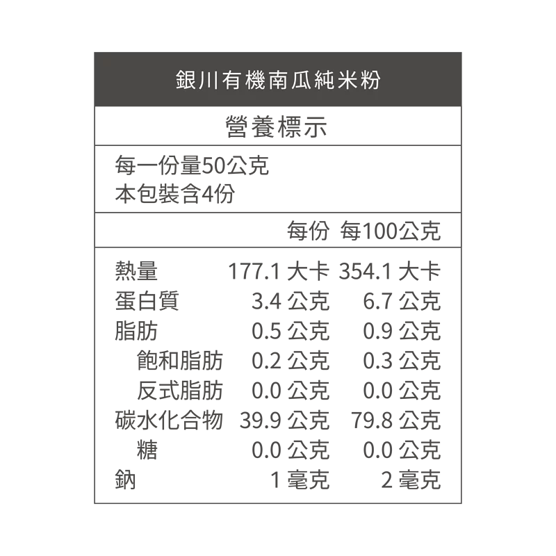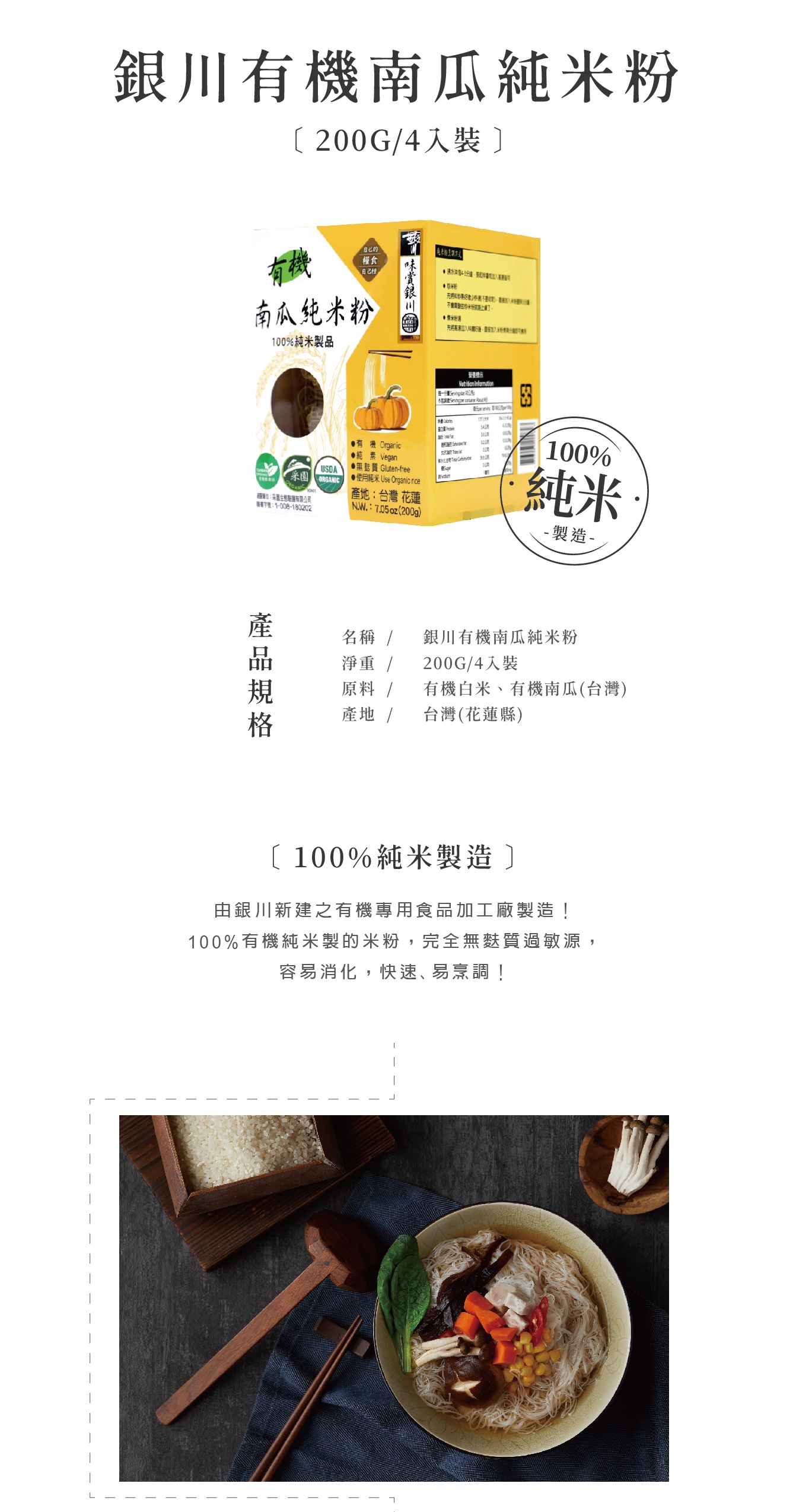 ◆ 由銀川新建之有機專用食品加工廠製造! ◆ 100%有機純米製的米粉,加上自產有機南瓜,完全無麩質過敏源,容易消化,快速、免浸泡,易烹調!